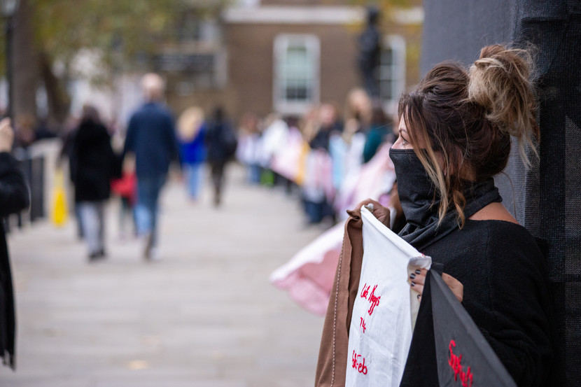 An art Installation / Protest against femicide that took place on Richmond Terrace, directly opposite Downing street on November 13th 2021. The protest displayed a line of pillowcases, each with the hand sewn name and age of a women murdered by male violence this year. The line of pillowcases measured an overwhelming 70 metres in length. The sheer numbers of names (*118 and rising) created quite a shocking and saddening impact. Through the power of gathering we aimed to offer a vigil of sorts to acknowledge not only some of the women murdered by male violence, but all women with equal respect and recognition.