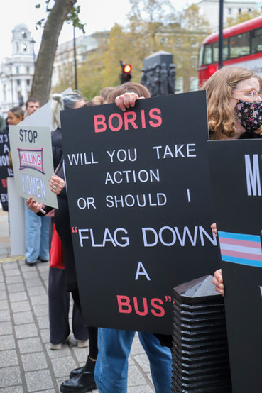 After this peaceful action a number of us moved over to the Downing Street gates with handmade placards to call on Boris to take action against the epidemic violence against Women.